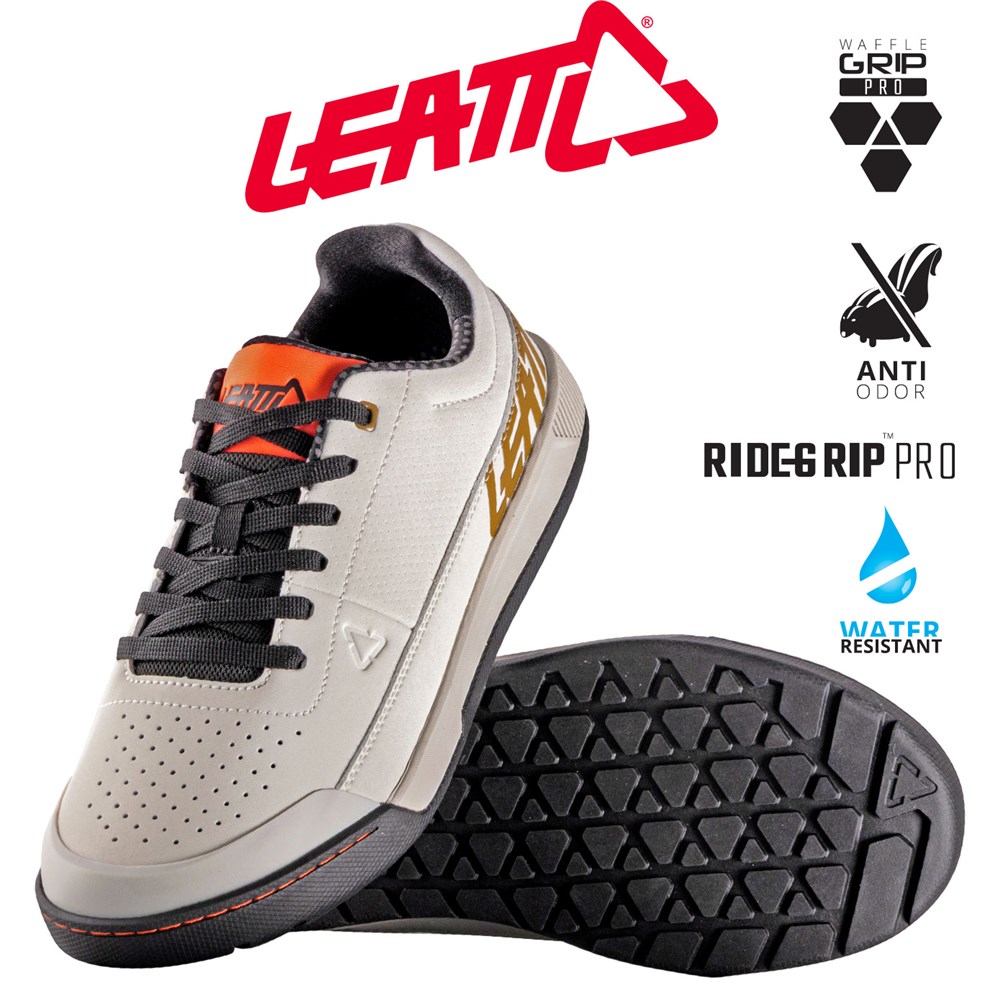 The  Leatt MTB 2.0 shoe is a casual looking shoe transformed into a comfortable and well-ventilated riding shoe. It features a medium stiff sole, which gives you great control on the bike but lets you also walk around in ease.The amazing RideGrip rubber compound provides ultimate bike control in all weather conditions. The sole also features mud channels which efficiently keep the mud off the soles so that you are in constant contact with your pedals or the ground. Be prepared to ride, anytime, anywhere!
