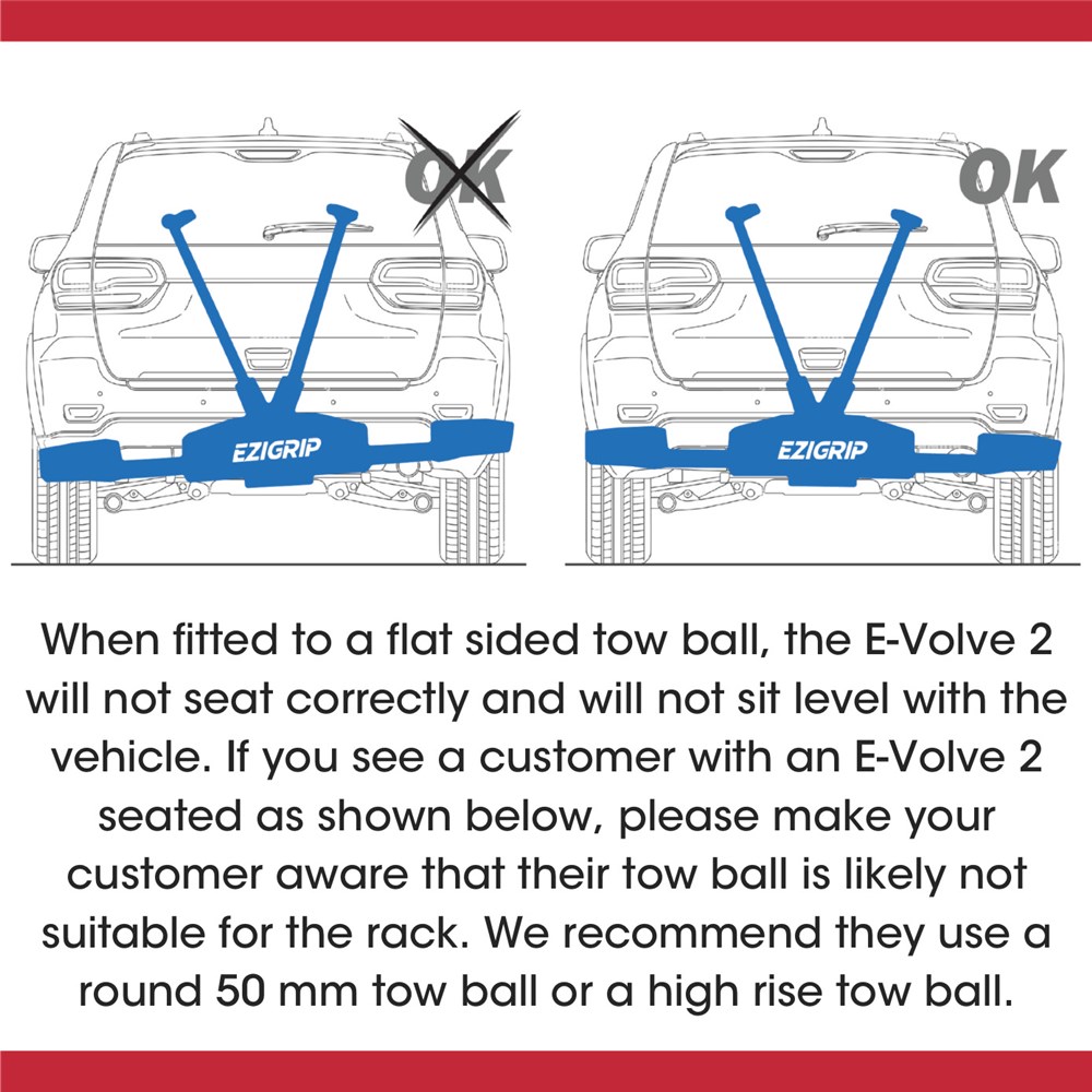 When fitted to a flat sided tow ball, the E-Volve 2 will not seat correctly and will not sit level with the vehicle. If you see a customer with an E-Volve 2 seated as shown below, please make your customer aware that their tow ball is likely not suitable for the rack. We recommend they use a round 50 mm tow ball or a high rise tow ball.
