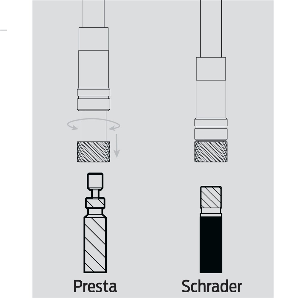 - Presta: Unscrew two parts of valve connector completely from each other. Then pull the connector out. Screw outer most piece of valve connector only onto Presta valve.