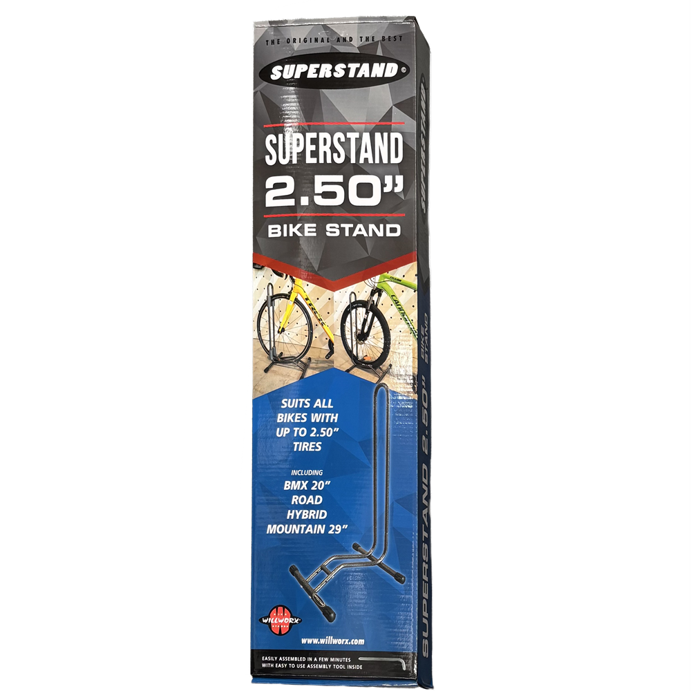 Superstand uses no more space than the bike itself - perfect when you have minimal space available. Wheel in and wheel out your bicycle with either the front or rear wheel. Providing horizontal and vertical wheel support. Superstand clears all sprockets, gears, derailleurs and brake discs etc. Made from powder-coated, strong tubular steel. The Superstand suits all 20” BMX, Racing, Mountain and Hybrid bicycles with up to 29er wheels and 2.5” wide tyres.