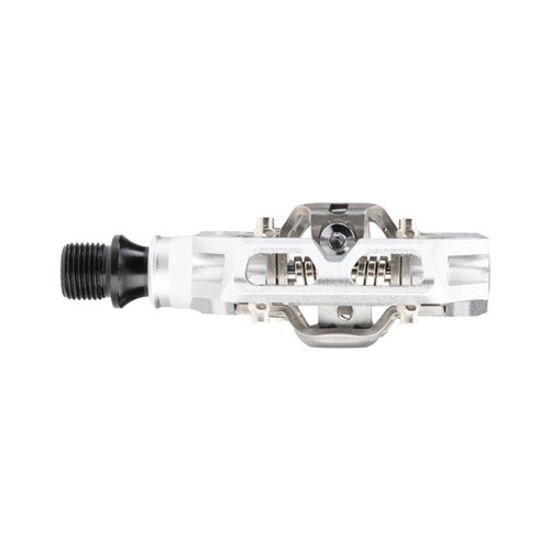 A Trail and All-Mtn clipless pedal body CNC-machined out of 6061-T6 aluminum. It utilizes an ultra-robust forged and CNC-machined chromoly steel axle. The fully serviceable triple-bearings system consists of a LSL self-lubricating bushing, a needle bearing, and an industrial roller bearing. Quad seals keep the internals remain dry in any conditions. The dual-sided clip-in system is compatible with classic SPD cleats. The retention system has an adjustable spring tension to finetune entry and relase, while offering 5 degrees of free float. The medium platform around the clip-in system provides a solid shoe support for power transfer, and the dropped front portions facilitate shoe entry. Four removable pins increase stability and traction in technical situations when disengaged from the pedal.