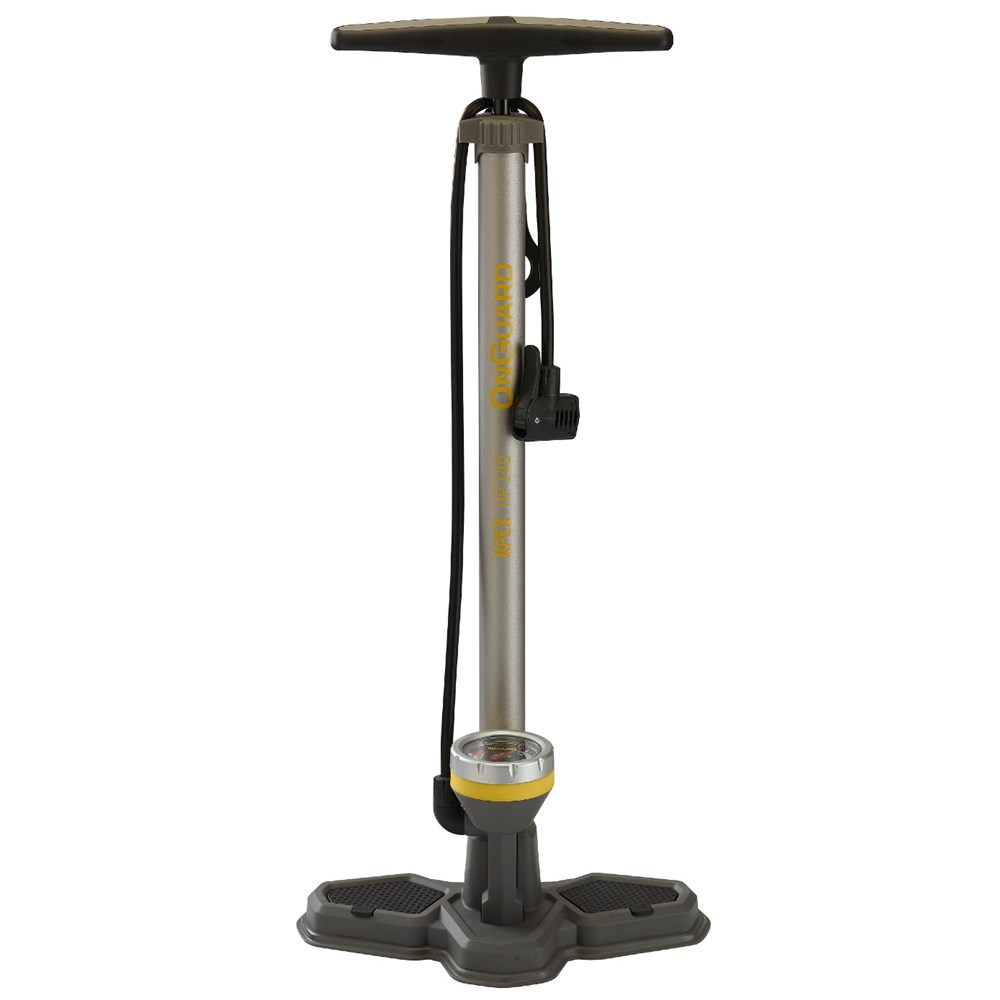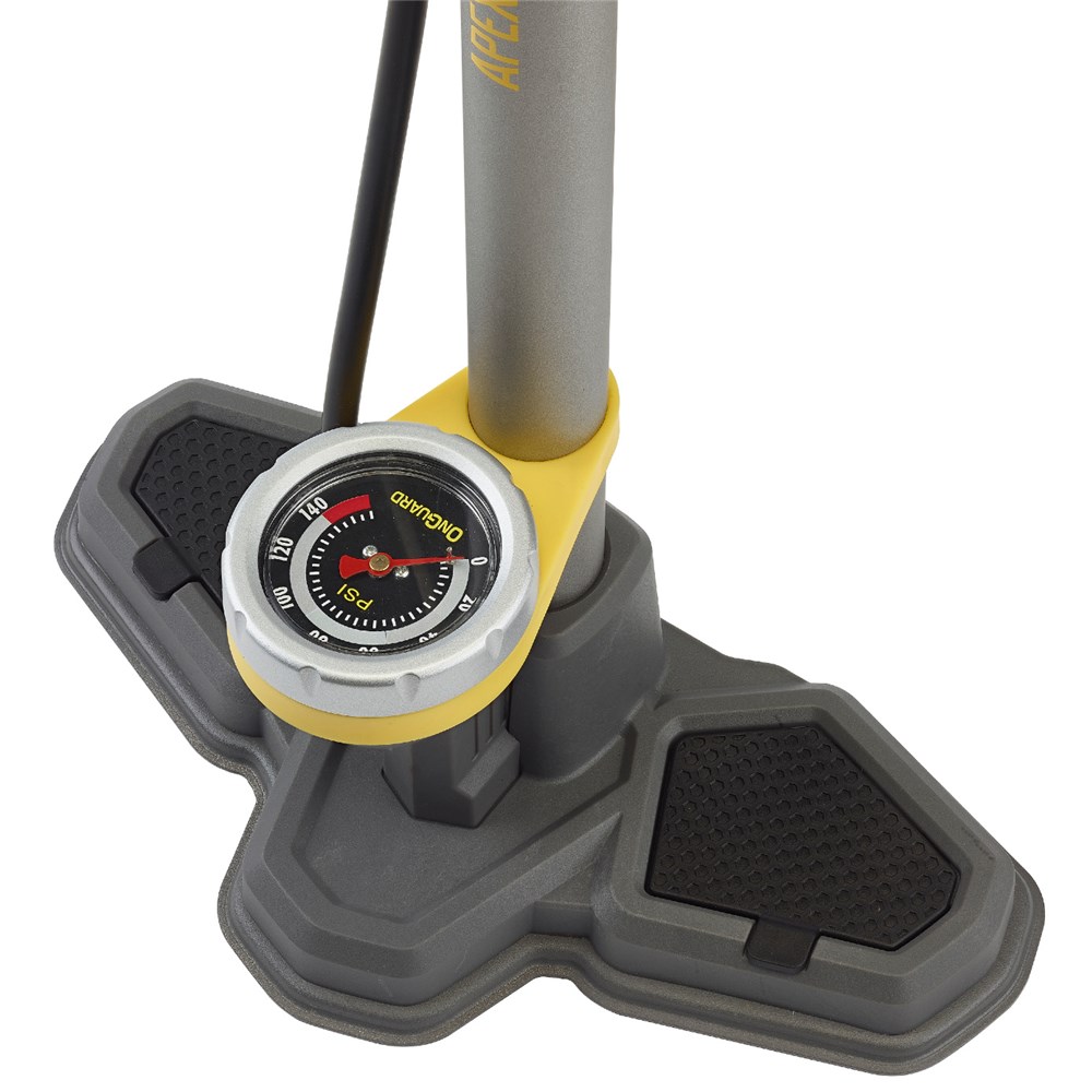 Capable of delivering up to 140psi, this floor pump ensures your tyres are always perfectly inflated for peak performance. This floor pump features a dual pump head compatible with both Presta and Schrader valves, providing versatility and ease of use. Its high-volume capacity allows for quick and efficient inflation, making it an essential tool for every cyclist. Built witha sturdy base and built-in compartment for the included ball needles, and an ergonomic handle for stability and ease during use. The integrated pressure gauge offers accurate readings, ensuring you can achieve the precise pressure needed for your ride.
