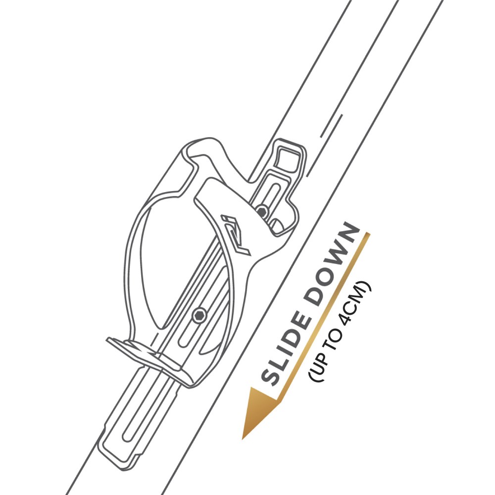 With the Kinetic Cage, you can easily adjust the position of your water bottle cage up or down on your frame's downtube or seat tube for a custom fit that suits your reach and space. The Kinetic Cage features an extension to the water bottle cage that allows for up to 60mm of upward or 40mm of downward movement. Made from durable glass-filled nylon, the Kinetic Cage is designed to securely hold your bottle without breaking. Installation is a breeze, and the Kinetic Cage is specifically designed for right-handed use on DT or left-handed use on ST. Customized cage screws ensure a tight and secure fit, and once installed on your bike, you can adjust the cage to your desired position for easy access to your water bottle. At Ryder Innovation, our goal is to enhance your riding experience. The Kinetic Cage achieves this by offering simple yet effective custom positioning capabilities that allow you to ride comfortably and hydrate as needed.